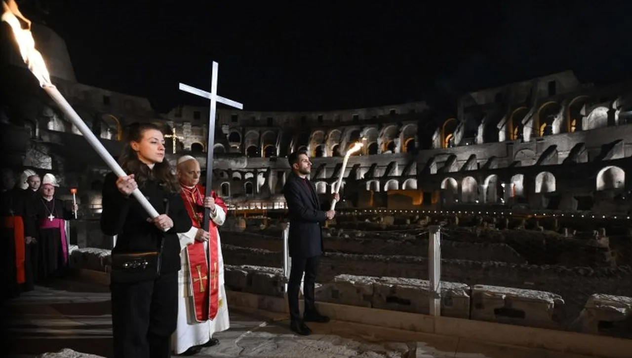 В Колизеума папата вдигна кръста и постави началото на обреда, придружаван от двама факлоносци, които го съпътстваха през цялото едночасово шествие - от вътрешността на древния амфитеатър, през събралите се миряни и нагоре по стръмните стълби към Палатинския хълм, където накрая отправи последната благословия.